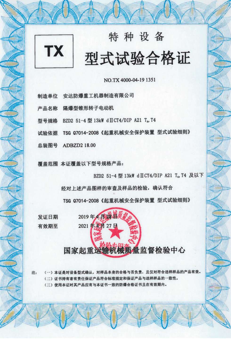 榮譽(yù)資質(zhì) 隔爆型錐形轉(zhuǎn)子電動機(jī) TX型式試驗(yàn)合格證