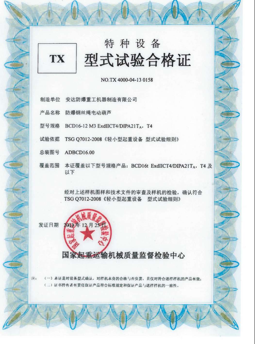 » 防爆鋼絲繩電動葫蘆 TX型式試驗合格證