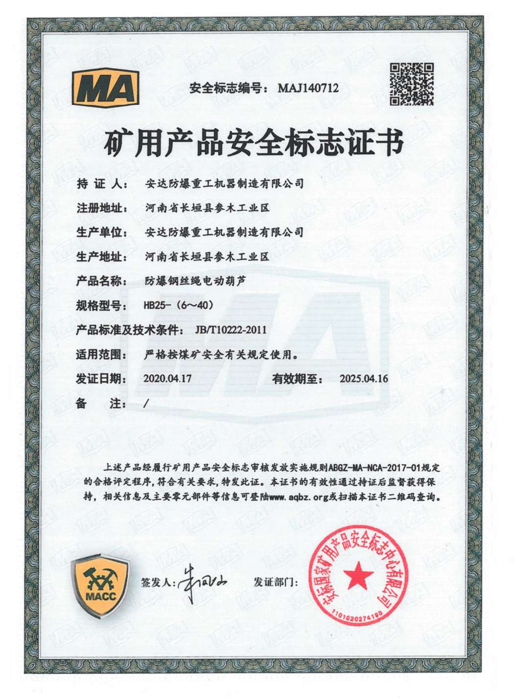 榮譽(yù)資質(zhì) 防爆鋼絲繩電動葫蘆 礦用產(chǎn)品安全標(biāo)志證書