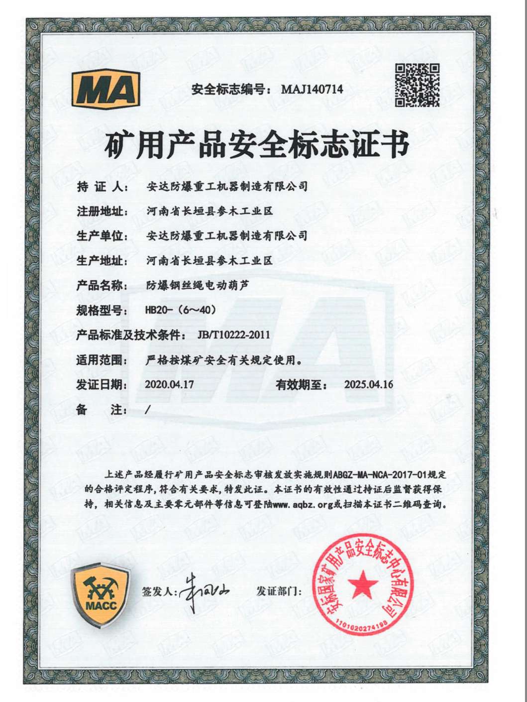 榮譽資質(zhì) 防爆鋼絲繩電動葫蘆 礦用產(chǎn)品安全標(biāo)志證書
