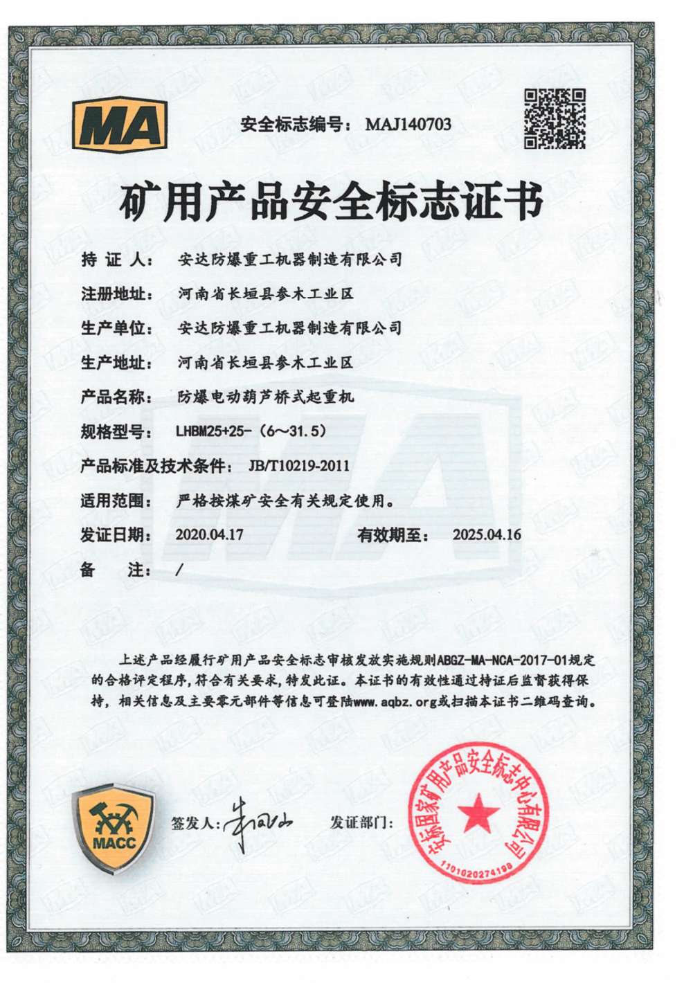 榮譽(yù)資質(zhì) 防爆鋼絲繩葫蘆橋式起重機(jī) 礦用產(chǎn)品安全標(biāo)志證書