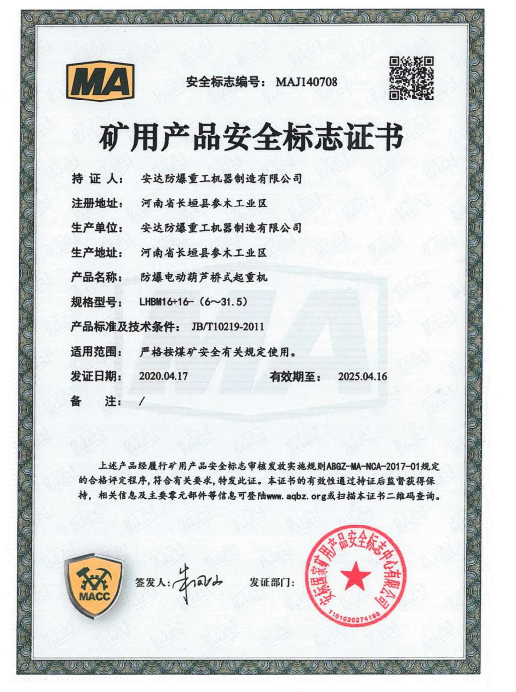 您當(dāng)前的位置:首頁(yè) » 榮譽(yù)資質(zhì) » 防爆鋼絲繩葫蘆橋式起重機(jī) 礦用產(chǎn)品安全標(biāo)志證書