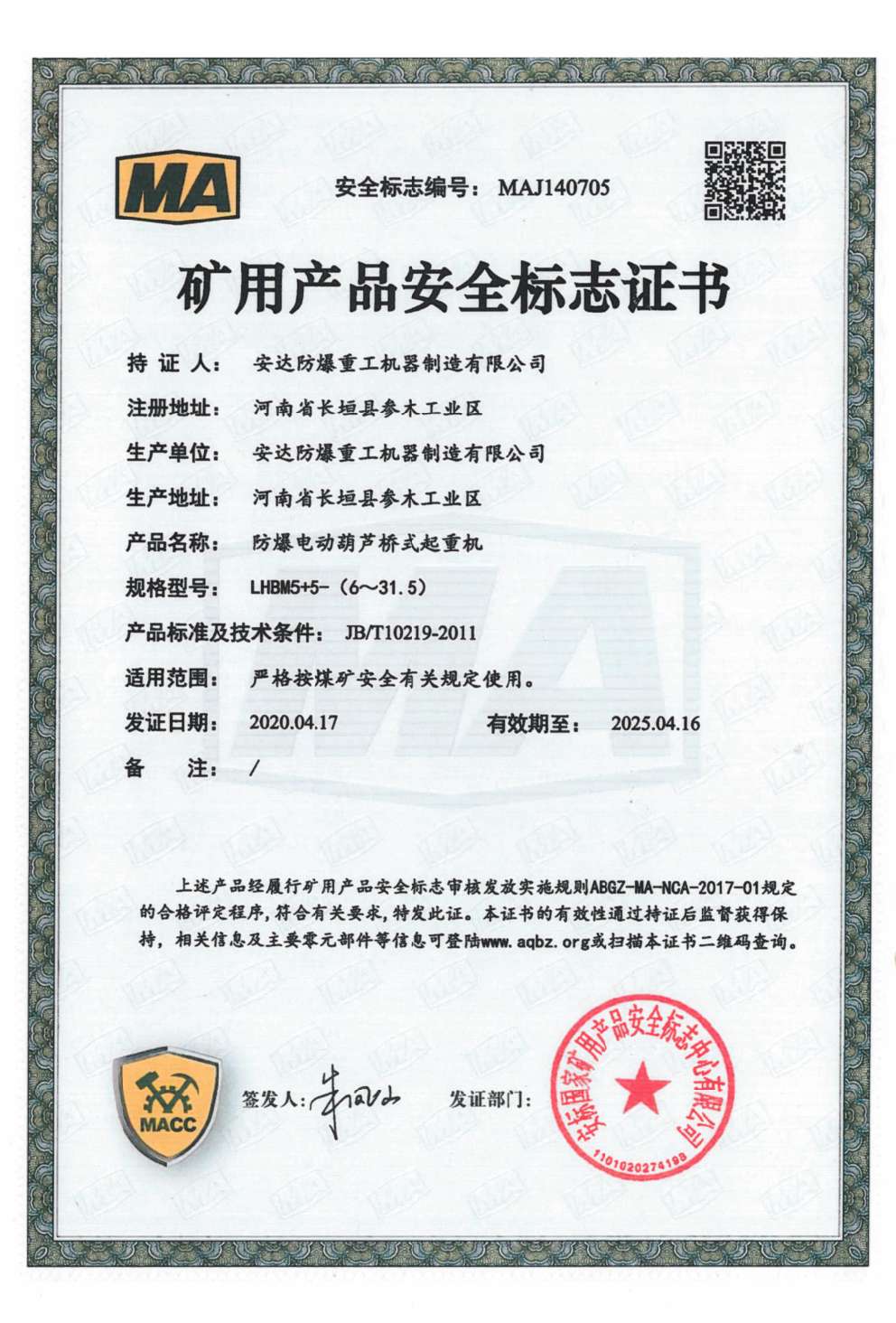 » 防爆鋼絲繩葫蘆橋式起重機 礦用產(chǎn)品安全標志證書