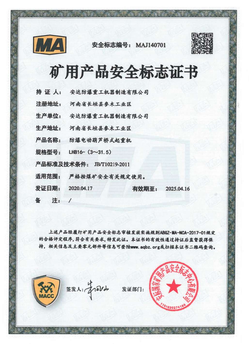 | 發(fā)證機構(gòu): | 安標(biāo)國家礦用產(chǎn)品安全標(biāo)志中心有限公司 | 發(fā)證時間 : | 2020-04-17 |