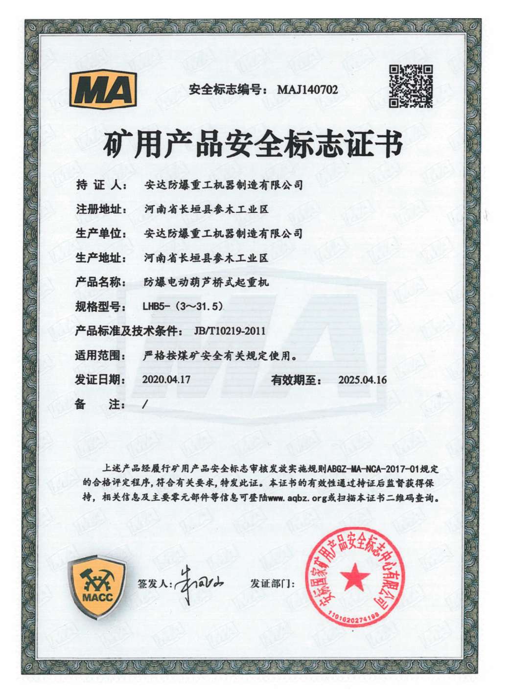 防爆鋼絲繩葫蘆橋式起重機 礦用產品安全標志證書