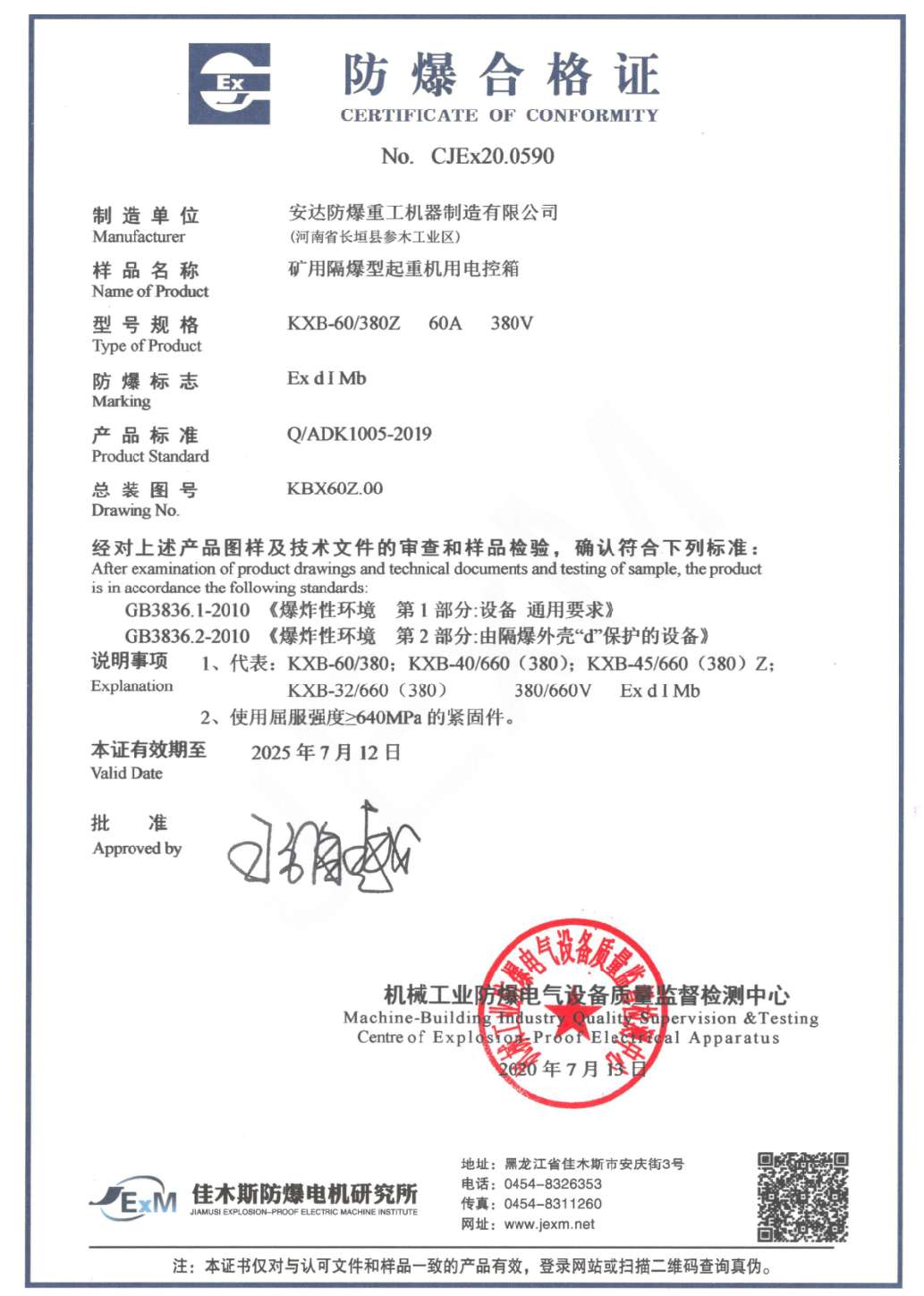 | 發(fā)證機(jī)構(gòu): | 機(jī)械工業(yè)防爆電氣質(zhì)量監(jiān)督檢測中心 | 發(fā)證時間 : | 2020-07-13 |
