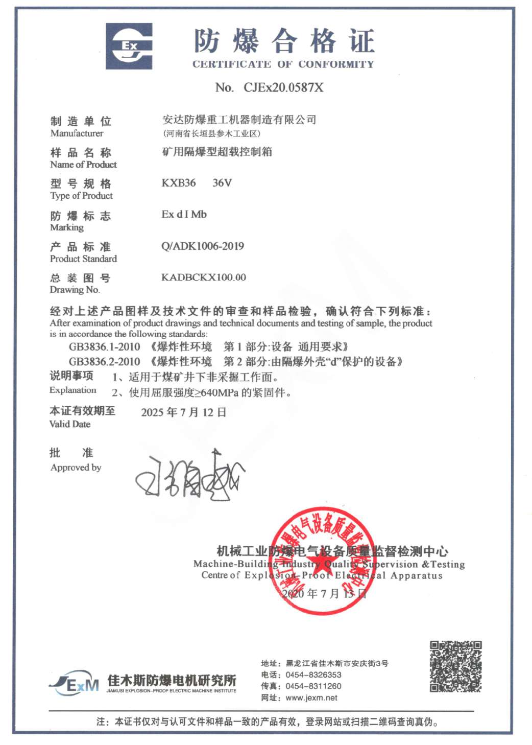 榮譽(yù)資質(zhì) 礦用隔爆型超載控制箱 防爆合格證