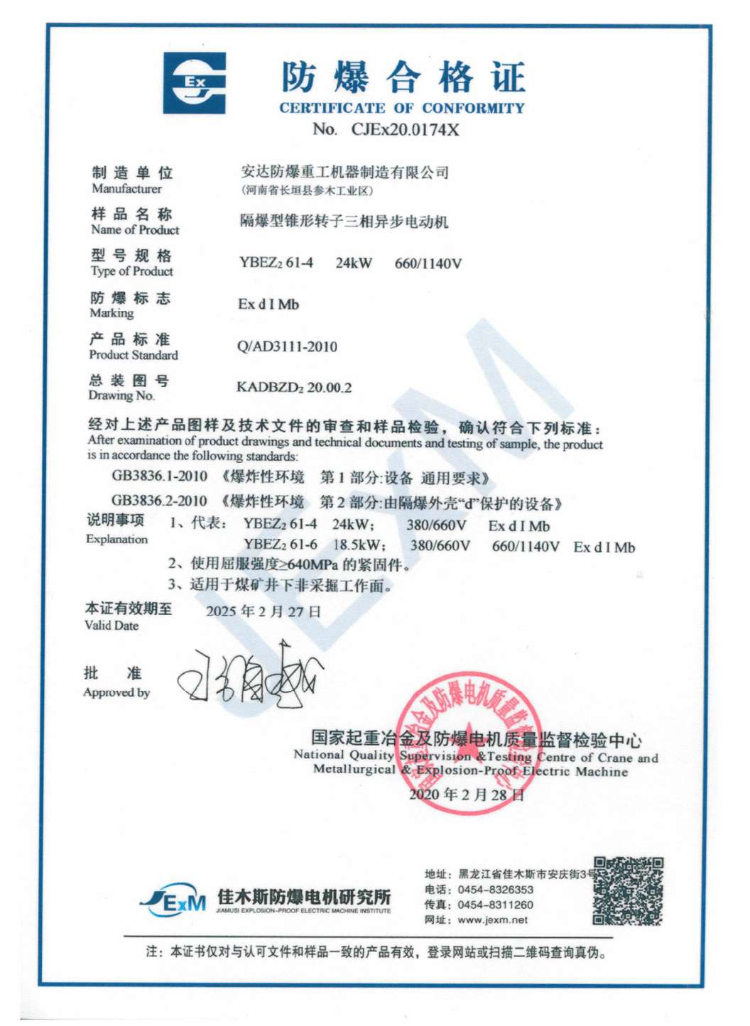 | 發(fā)證機(jī)構(gòu): | 國家起重冶金及防爆電機(jī)質(zhì)量監(jiān)督檢測中心 | 發(fā)證時間 : | 2020-02-28 |