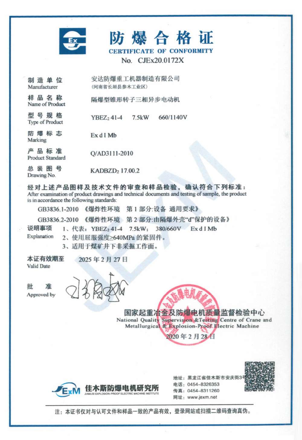 | 發(fā)證機(jī)構(gòu): | 國家起重冶金及防爆電機(jī)質(zhì)量監(jiān)督檢測(cè)中心 | 發(fā)證時(shí)間 : | 2020-02-28 |