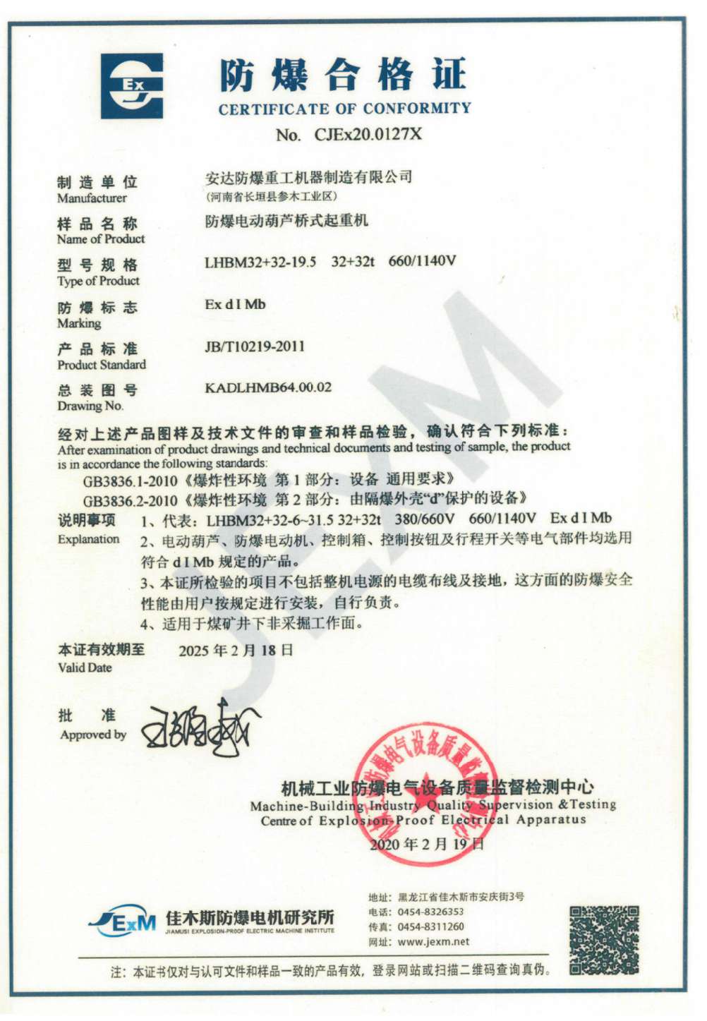 榮譽(yù)資質(zhì) 防爆鋼絲繩電動(dòng)葫蘆 防爆合格證