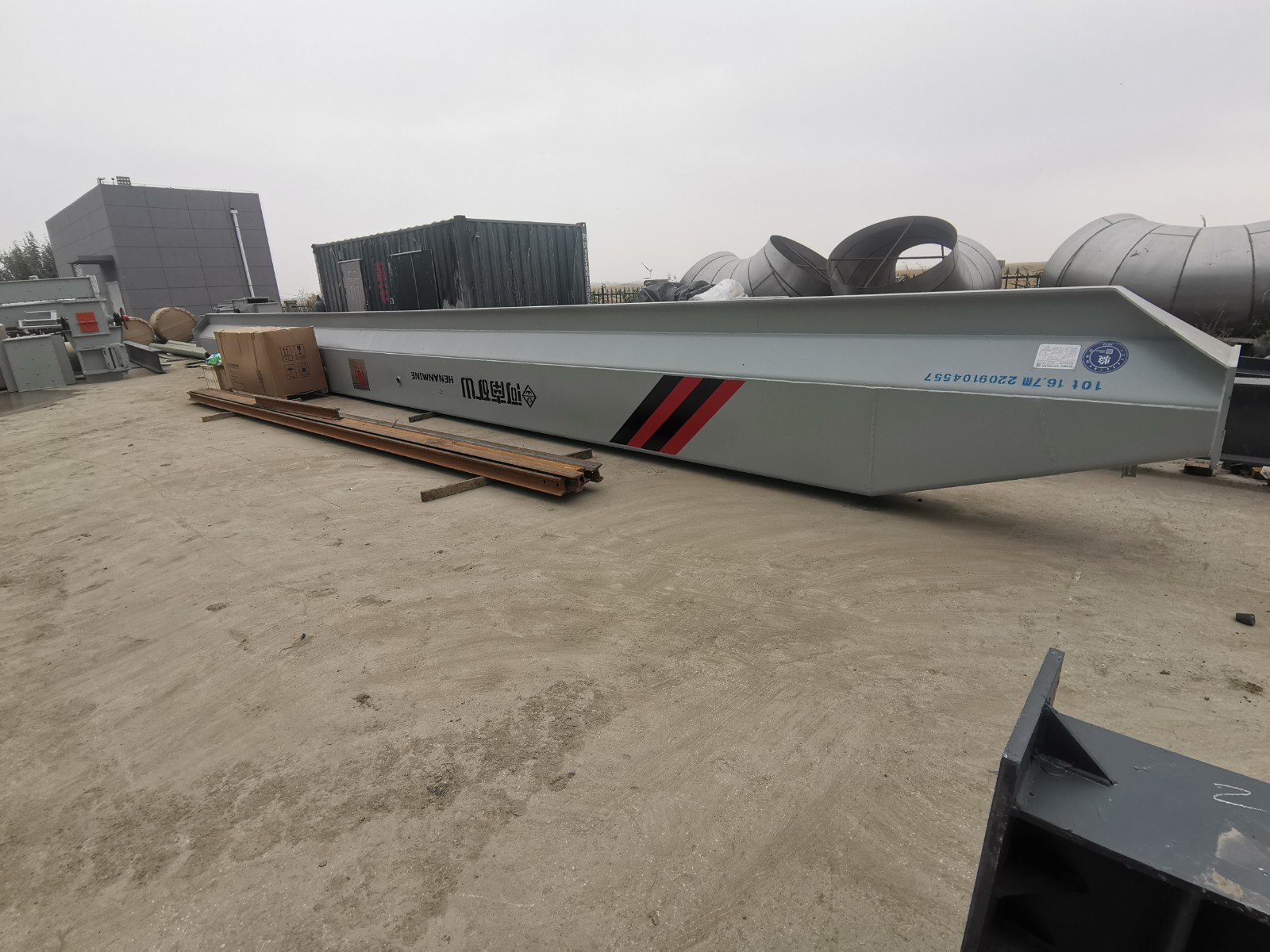 橋架是橋式起重機(jī)的基本構(gòu)件,它由主梁、端梁、走臺(tái)等部分組成。主梁跨架在跨間上空,有箱形、析架、腹板、圓管等結(jié)構(gòu)形式。主梁兩端連有端梁,在兩主梁外側(cè)安有走臺(tái),設(shè)有安全欄桿。在駕駛室一側(cè)的走臺(tái)上裝有大車(chē)移行機(jī)構(gòu),在另一側(cè)走臺(tái)上裝有往小車(chē)電氣設(shè)備供電的裝置,即輔助滑線(xiàn)。在主梁上方鋪有導(dǎo)軌,供小車(chē)移動(dòng)。整個(gè)橋式起重機(jī)在大車(chē)移動(dòng)機(jī)構(gòu)拖動(dòng)下,沿車(chē)間長(zhǎng)度方向的導(dǎo)軌上移動(dòng)。