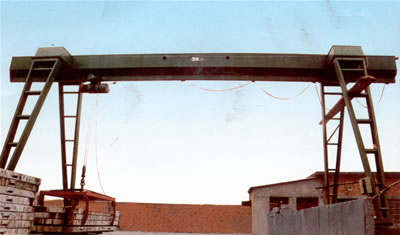 它的金屬結(jié)構(gòu)像門形框架,承載主梁下安裝兩條支腳,可以直接在地面的軌道上行走,主梁兩端可以具有外伸懸臂梁。