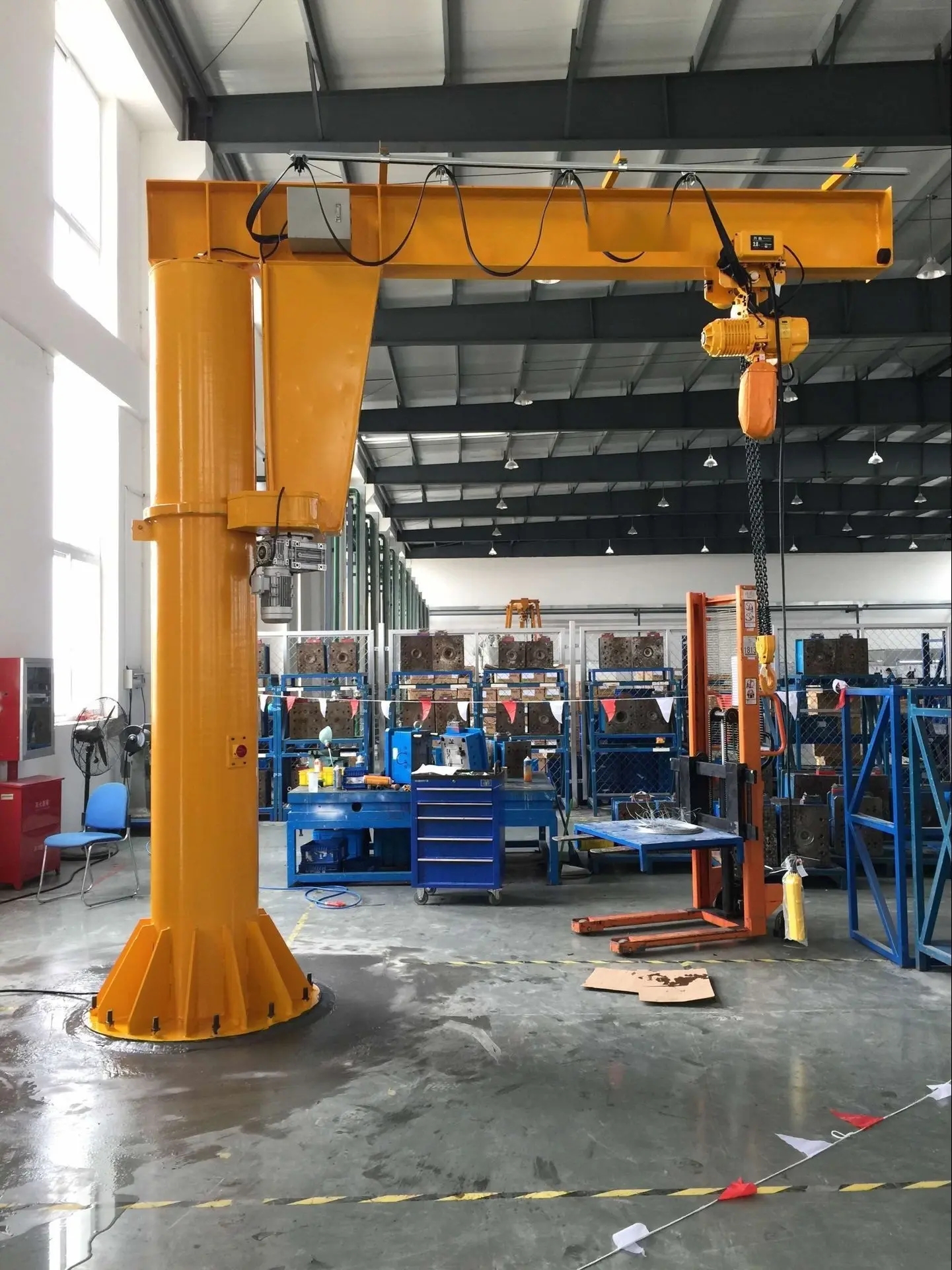 本產(chǎn)品廣泛用于各種行業(yè)的不同場所。懸臂起重機工作強度為輕型,起重機由立柱,回轉(zhuǎn)臂回轉(zhuǎn)驅(qū)動裝置及電動葫蘆組成,立柱下端通過地腳螺栓固定在混凝土基礎(chǔ)上,由擺線針輪減速裝置來驅(qū)動旋臂回轉(zhuǎn),電動葫蘆在旋臂工字鋼上作左右直線運行,并起吊重物。起重機旋臂為空心型鋼結(jié)構(gòu),自重輕,跨度大,起重量大,經(jīng)濟耐用。