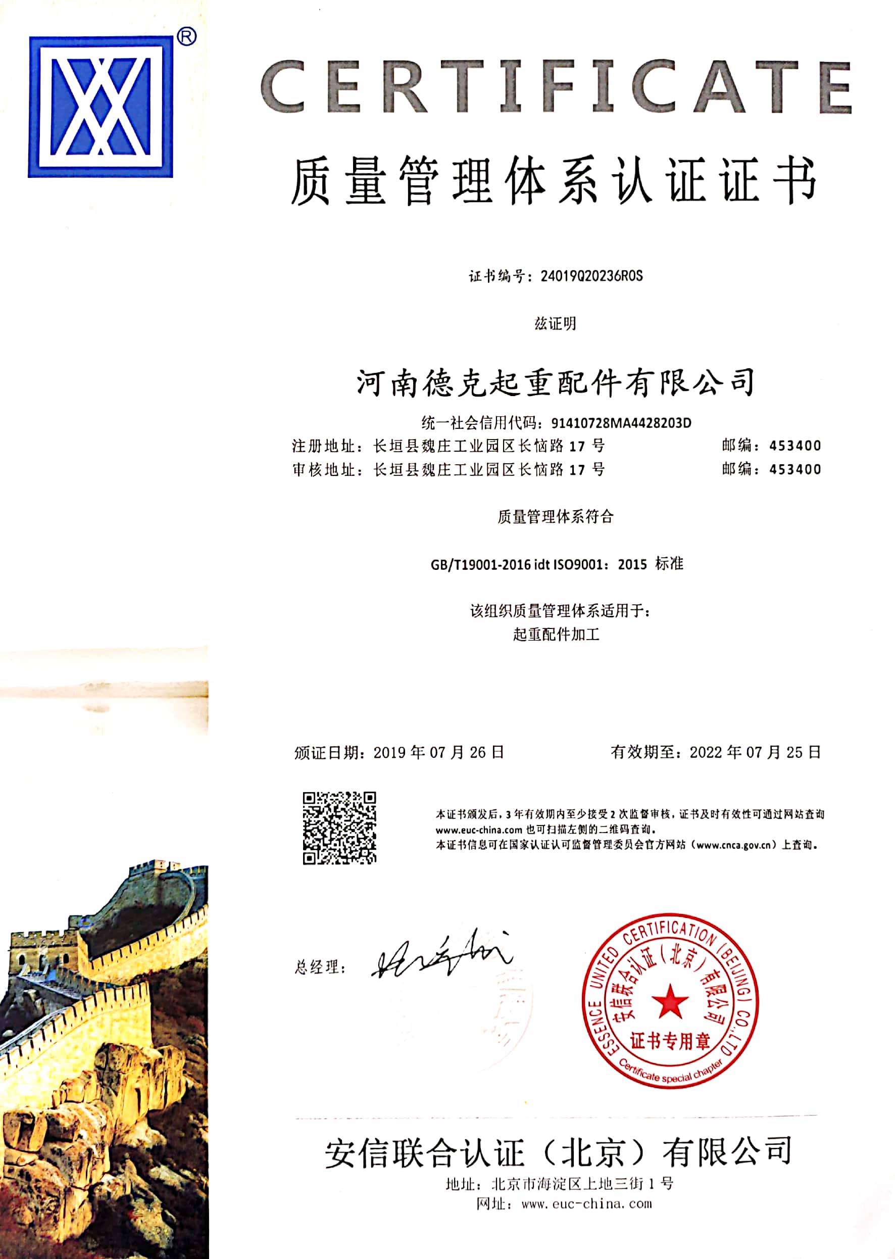 證書介紹 河南德克起重配件有限公司質(zhì)量管理體系適用于:起重配件加工