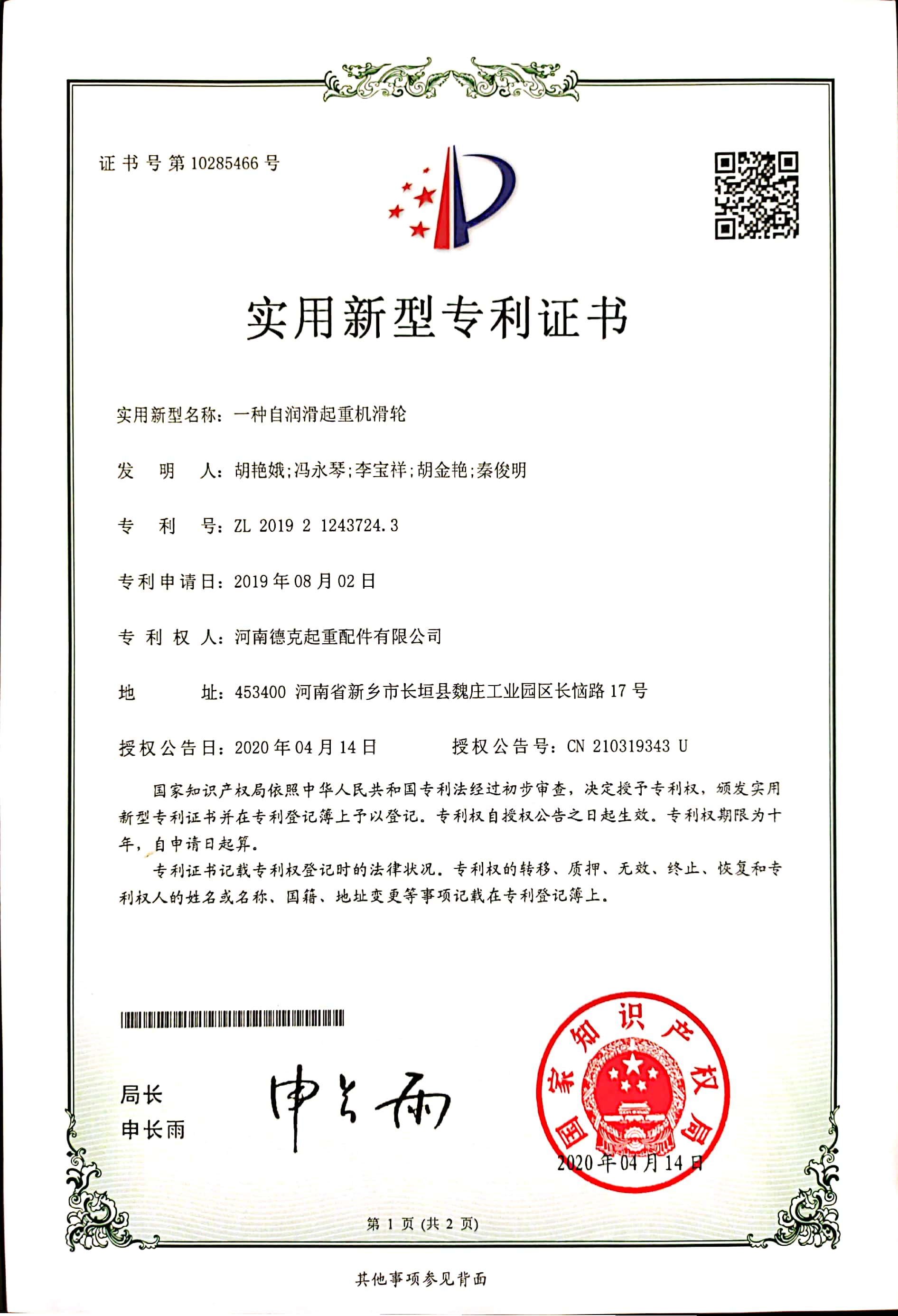 證書介紹 一種自潤滑起重機(jī)滑輪