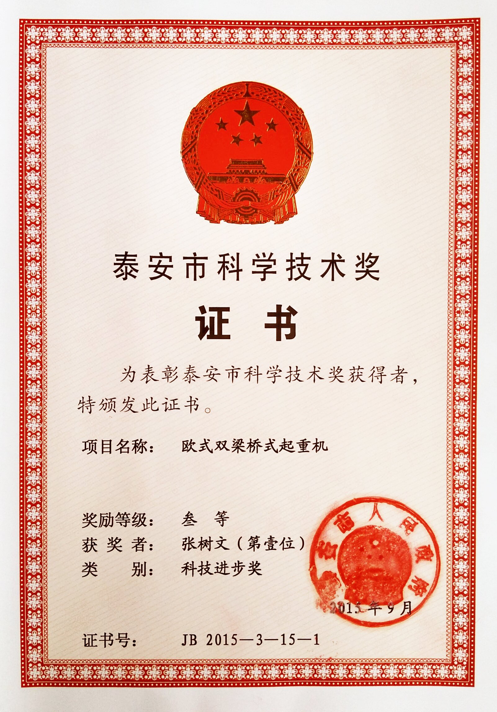 | 發(fā)證機(jī)構(gòu): | 泰安市人民政府 | 發(fā)證時(shí)間 : | 2015-09-15 |