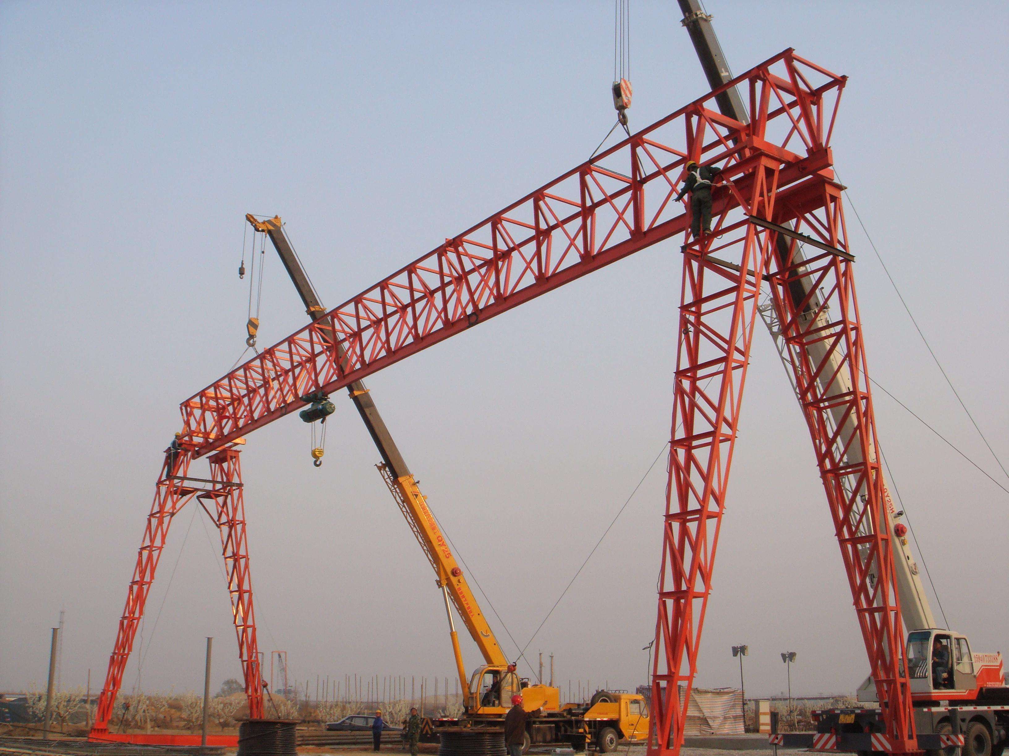 它的金屬結(jié)構(gòu)像門形框架,承載主梁下安裝兩條支腳,可以直接在地面的軌道上行走,主梁兩端可以具有外伸懸臂梁