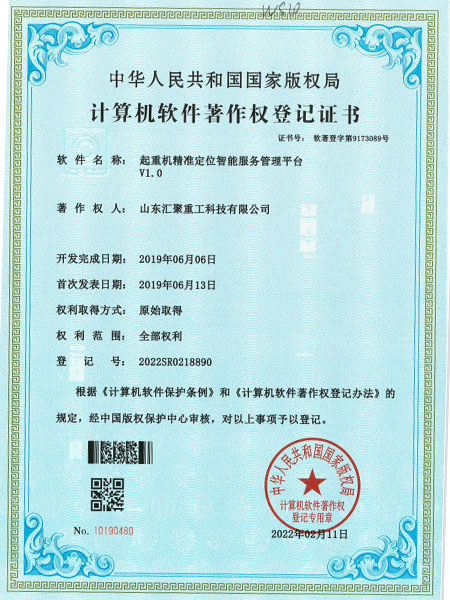 榮譽(yù)資質(zhì) 起重機(jī)**定位智能服務(wù)管理平臺(tái) V1.0(自動(dòng)化證書(shū))