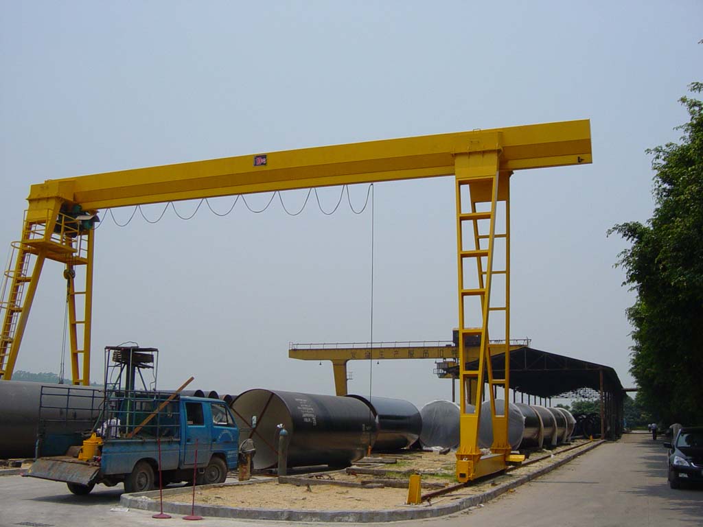 它的金屬結構像門形框架,承載主梁下安裝兩條支腳,可以直接在地面的軌道上行走,主梁兩端可以具有外伸懸臂梁。