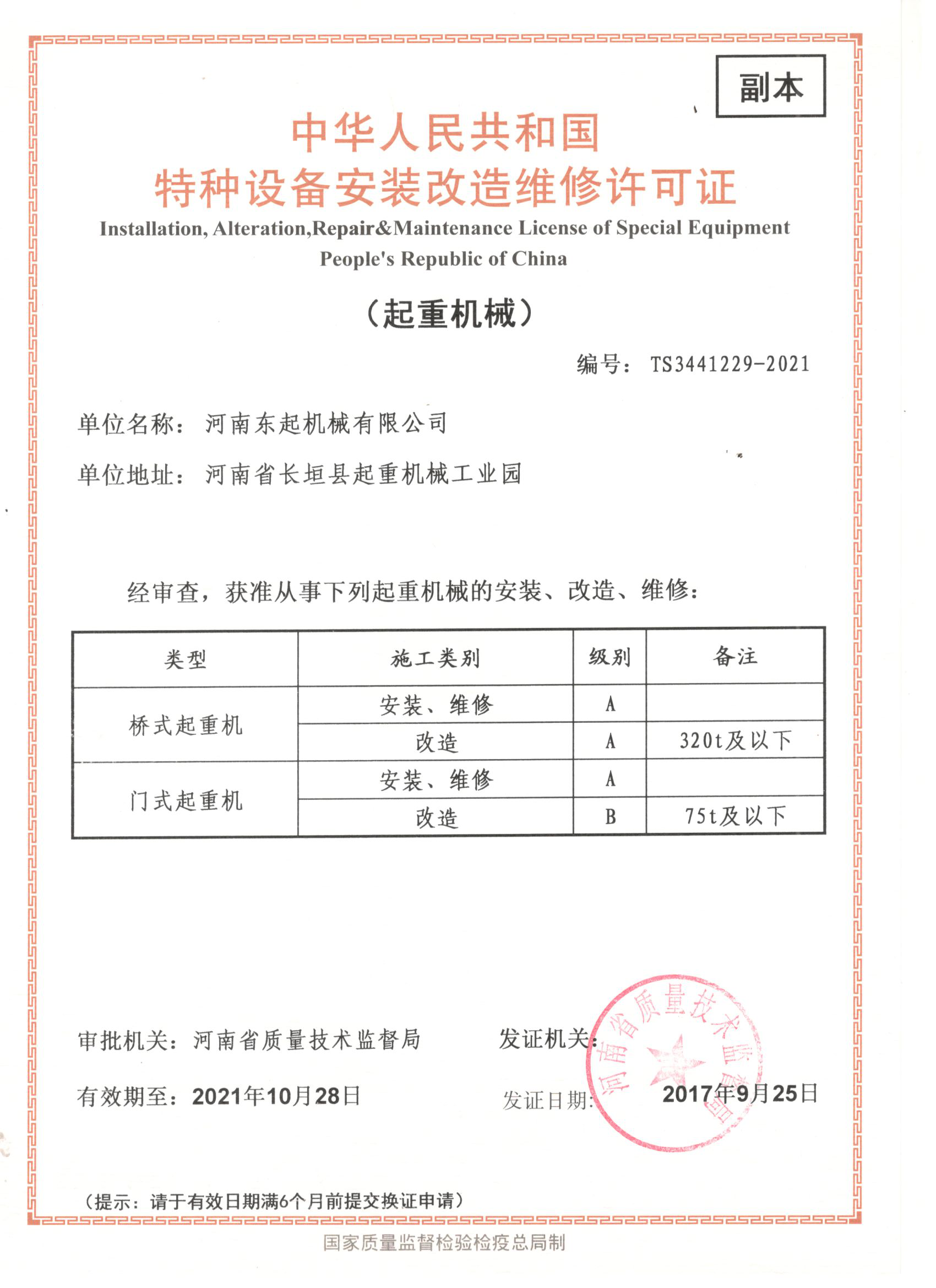 您當(dāng)前的位置:首頁 » 榮譽(yù)資質(zhì) » 中華人民共和國(guó)特種設(shè)備安裝改造維修許可證