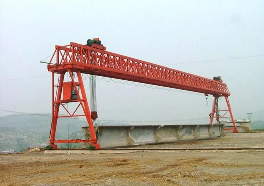 提梁機既可兩臺配合抬吊預(yù)制梁,也可以單臺起重機配雙吊具起吊預(yù)制梁,兩臺同時起重的提梁機各自的起重量一般為450噸,單臺起重的提梁機起重量通??蛇_900噸。它配置支腿行走、天車行走及天車起吊設(shè)備,可以實現(xiàn)全方位機械化動作。主要用于將預(yù)制梁從制梁臺提吊至存梁臺位,預(yù)制梁養(yǎng)護完成后將其從存梁臺位吊運到運梁車上。作為起重設(shè)備完成架橋機的組裝和拆卸。還用于架設(shè)墩身不高的旱橋