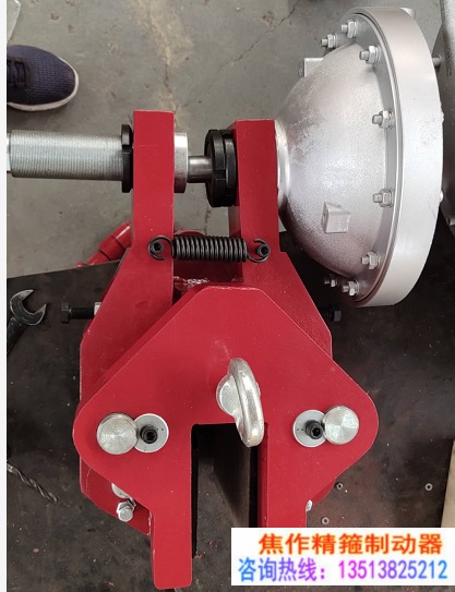1、氣缸, 2、右制動臂 3、復位彈簧 5、活塞桿 6、調(diào)整桿 7、螺母 8、左制動臂 9、基座 10、制動塊11、彈簧鋼絲 12、摩擦片