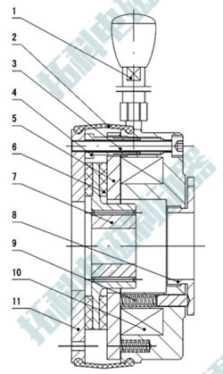 1-釋放手柄 2-防塵罩 3-安裝螺釘 4-空心螺栓 5-銜鐵 6-制動盤7-齒輪套 8-調(diào)節(jié)螺母 9-彈簧 10-磁軛組件 11-安裝板