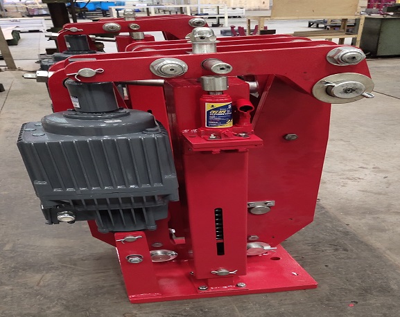 (5)、將已打開的制動(dòng)器緩慢平穩(wěn)的移動(dòng)到其安裝的位置,穿上地腳螺栓,并松松擰上螺母。注意:在移動(dòng)制動(dòng)器時(shí),嚴(yán)禁磕碰推動(dòng)器。