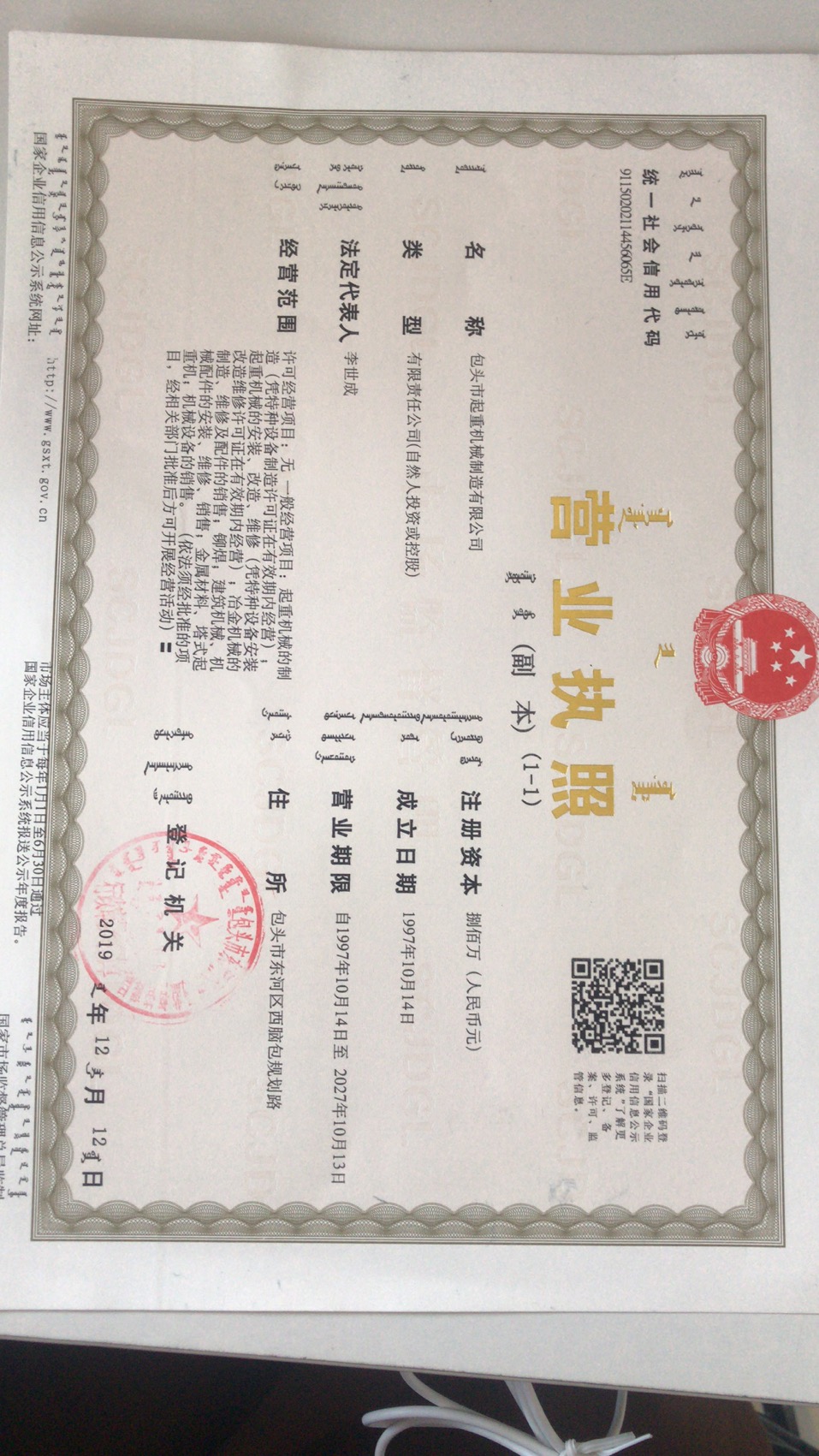 | 發(fā)證機(jī)構(gòu): | 包頭市監(jiān)督局 | 發(fā)證時間 : | 2019-12-12 |