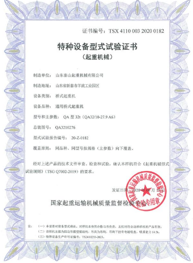 榮譽(yù)資質(zhì) 特種設(shè)備型式試驗(yàn)證書 (起重機(jī)械)橋式起重機(jī) (通用橋式起重機(jī))