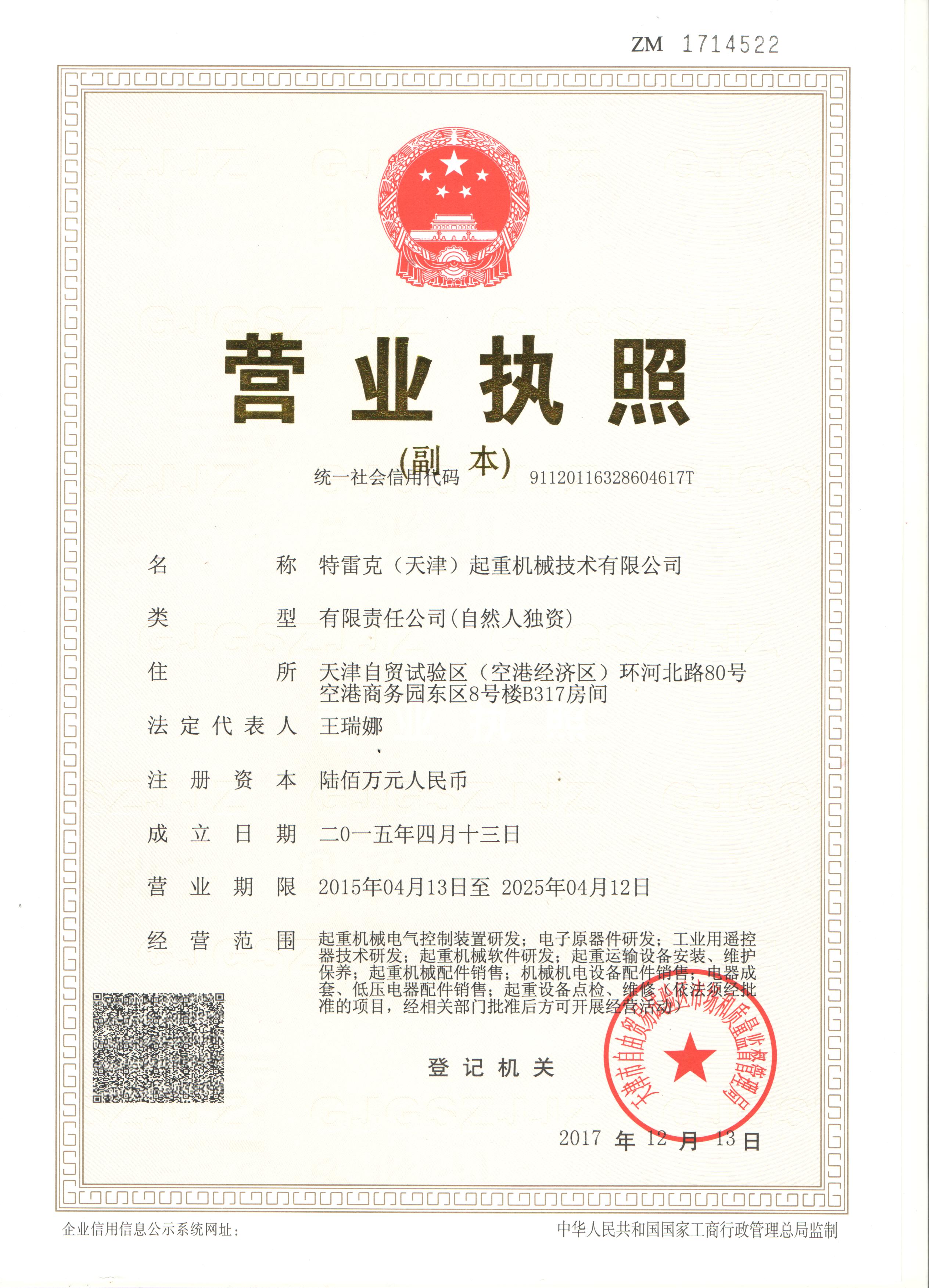 證書介紹 2015年特雷克(天津)起重機(jī)械技術(shù)有限公司正式成立,主營(yíng)起重機(jī)械電氣控制裝置研發(fā),電子元器件研發(fā),工業(yè)用遙控器技術(shù)研發(fā),起重機(jī)械軟件研發(fā),起重運(yùn)輸設(shè)備安裝,維修和保養(yǎng),起重機(jī)械配件銷售,機(jī)械機(jī)電設(shè)備配件銷售,電器成套,低壓電器配件銷售,起重設(shè)備點(diǎn)檢維修等經(jīng)相關(guān)部門批準(zhǔn)可開展經(jīng)營(yíng)**。