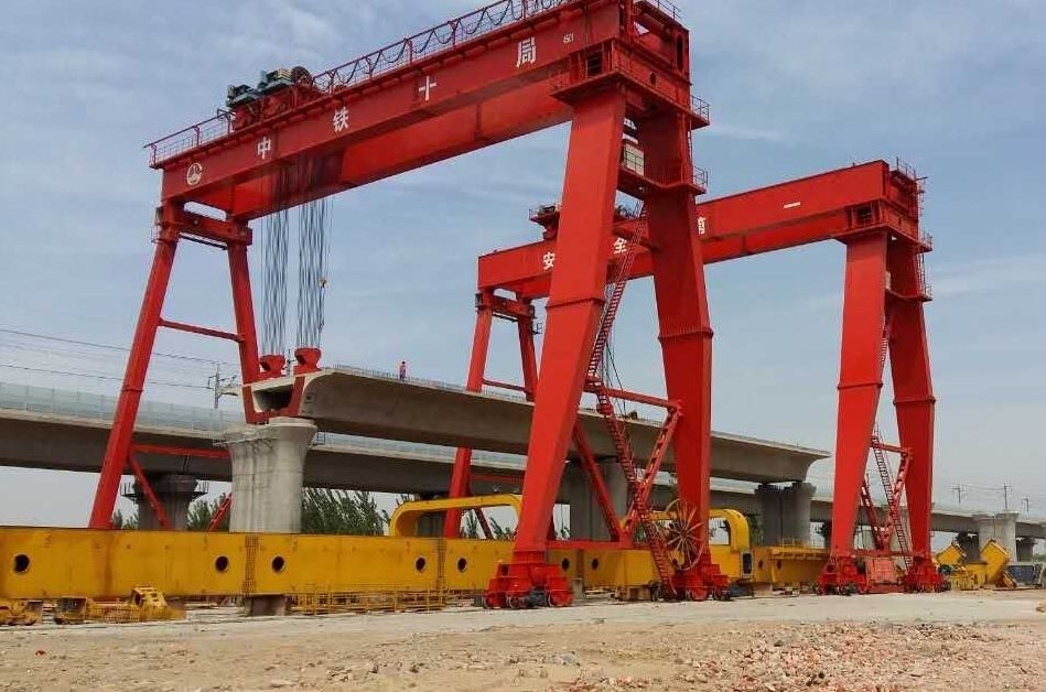 提梁機既可兩臺配合抬吊預(yù)制梁,也可以單臺起重機配雙吊具起吊預(yù)制梁,兩臺同時起重的提梁機各自的起重量一般為450噸,單臺起重的提梁機起重量通??蛇_(dá)900噸。它配置支腿行走、天車行走及天車起吊設(shè)備,可以實現(xiàn)全方位機械化動作。主要用于將預(yù)制梁從制梁臺提吊至存梁臺位,預(yù)制梁養(yǎng)護完成后將其從存梁臺位吊運到運梁車上。作為起重設(shè)備完成架橋機的組裝和拆卸。還用于架設(shè)墩身不高的旱橋。