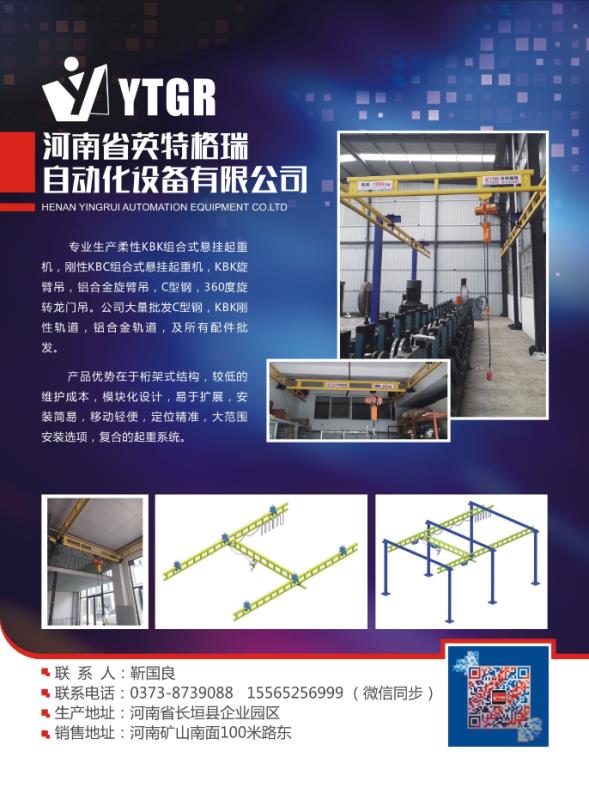:專業(yè)生產(chǎn)柔性KBK組合式懸掛起重機,剛性KBC組合式懸掛起重機,KBK旋臂吊,鋁合金旋臂吊,C型鋼,360度旋轉(zhuǎn)龍門吊。我公司的優(yōu)勢在于桁架式結(jié)構(gòu),較低的維護(hù)成本,模塊化設(shè)計,易于擴(kuò)展,安裝簡易,移動輕便,