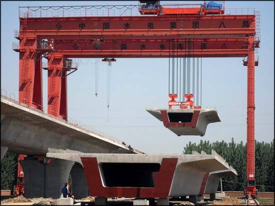 提梁機(jī)既可兩臺配合抬吊預(yù)制梁,也可以單臺起重機(jī)配雙吊具起吊預(yù)制梁,兩臺同時(shí)起重的提梁機(jī)各自的起重量一般為450噸,單臺起重的提梁機(jī)起重量通??蛇_(dá)900噸。它配置支腿行走、天車行走及天車起吊設(shè)備,可以實(shí)現(xiàn)全方位機(jī)械化動(dòng)作。主要用于將預(yù)制梁從制梁臺提吊至存梁臺位,預(yù)制梁養(yǎng)護(hù)完成后將其從存梁臺位吊運(yùn)到運(yùn)梁車上。作為起重設(shè)備完成架橋機(jī)的組裝和拆卸。還用于架設(shè)墩身不高的旱橋。