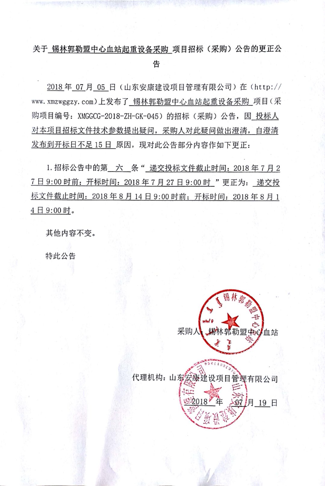 2018年 07月 05 日(山東安康建設(shè)項(xiàng)目管理有限公司)在(錫林郭勒盟政務(wù)服務(wù)和公共資源交易網(wǎng))上發(fā)布了 錫林郭勒盟中心血站起重設(shè)備采購(gòu) 項(xiàng)目(采購(gòu)項(xiàng)目編號(hào):XMGGCG-2018-ZH-GK-045)的招標(biāo)(采購(gòu))公告,因 投標(biāo)人對(duì)本項(xiàng)目招標(biāo)文件技術(shù)參數(shù)提出疑問(wèn),采購(gòu)人對(duì)此疑問(wèn)做出澄清,自澄清發(fā)布到開(kāi)標(biāo)日不足15日 原因,現(xiàn)對(duì)此公告部分內(nèi)容作如下更正: