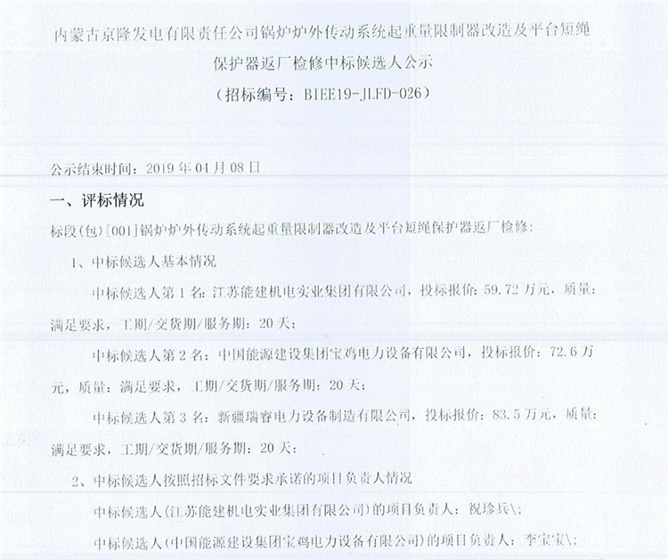 移動版:內(nèi)蒙古京隆發(fā)電有限責任公司鍋爐爐外傳動系統(tǒng)起重量限制器改造及平臺短繩保護器返廠檢修中標候選人公示