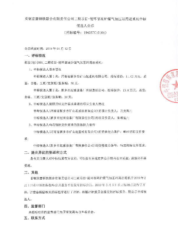 移動(dòng)版:首鋼京唐鋼鐵聯(lián)合有限責(zé)任公司二期項(xiàng)目-能環(huán)部高爐煤氣加壓站用起重機(jī)中標(biāo)候選人公示