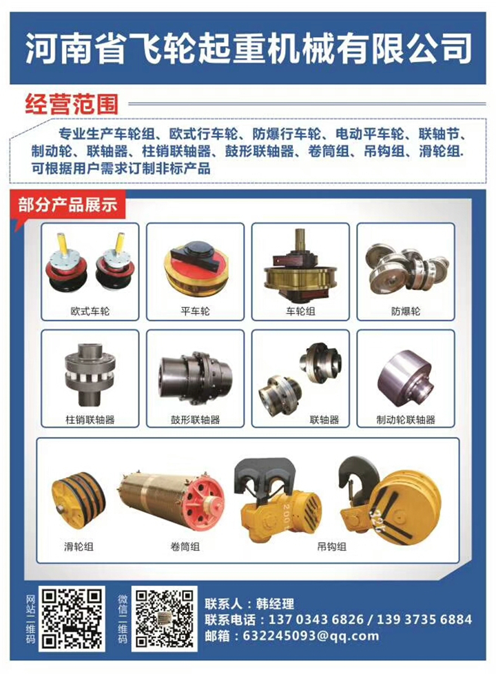 飛輪起重(http://flqizhong.chinacrane.net)16年專業(yè)生產(chǎn)車輪組,歐式行車輪,防爆行車輪,電動(dòng)平車輪,聯(lián)軸節(jié),制動(dòng)輪,聯(lián)軸器,柱銷聯(lián)軸器,鼓形聯(lián)軸器,卷筒組等雙梁起重配件。