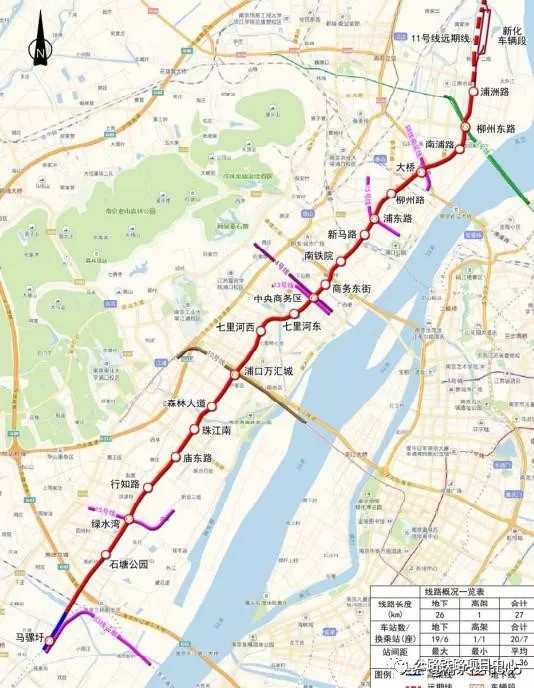 南京地鐵11號(hào)線(xiàn)一期工程整體呈西南-東北走向,南起馬騾圩站,北至浦洲路站,線(xiàn)路全長(zhǎng)約27km,其中:高架段長(zhǎng)約1km,過(guò)渡段長(zhǎng)約0.4km,地下段長(zhǎng)約25.6km,全線(xiàn)設(shè)車(chē)站20座(其中換乘站7座),其中高架站1座,地下站19座,最大站間距3.56km(馬騾圩站至石塘路公園站),最小站間距0.61km(新馬路站至浦東路站),平均站間距約1.4km。設(shè)車(chē)輛段1座,控制中心1座,主變電所2座。采用A型車(chē)、6輛編組,設(shè)計(jì)時(shí)速80km。工程建設(shè)期5年。