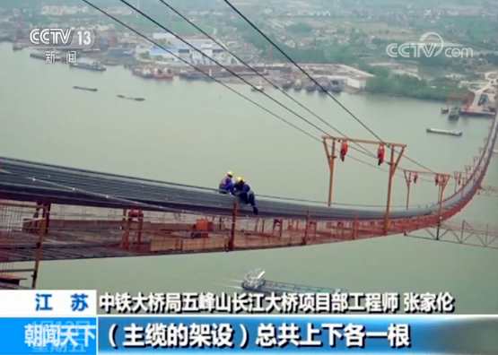 中鐵大橋局五峰山長江大橋項目部工程師 張家倫:這個貓道總長大概是1900米,最高點是在我們主塔這個地方,距離我們江面170多米,最低點距江面大概110米。主纜牽引的過程中,施工人員是要一直跟著主纜走。從北岸一直跟到南岸。觀察它的扭轉(zhuǎn),斷絲情況,都需要人員在貓道面上進(jìn)行行走觀察。