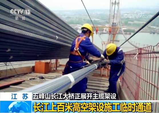 在現(xiàn)場記者看到,每一根主纜是由352根索股組成,每根索股長度約2000米,重約47.8噸,全部安裝到位后組成的主纜直徑將達(dá)到1.3米,而要想完成主纜架設(shè),單靠機(jī)械還不行,必須配合人工輔助。為此,在長江上的百米高空,施工人員架設(shè)起了與主纜平行的臨時通道,這條通道是由鋼絲和木板組成,工人們因為要經(jīng)常貓著腰施工,因此也管它叫貓道。