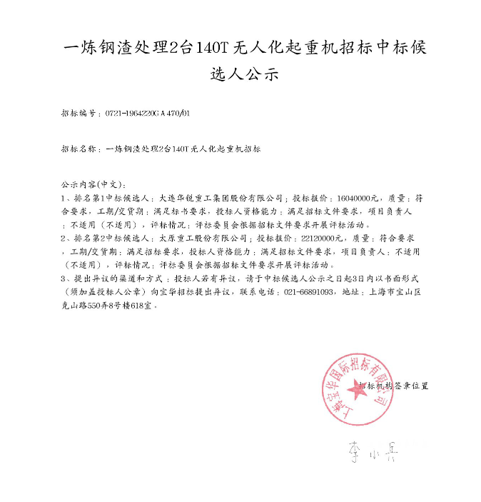 一煉鋼渣處理2臺(tái)140T無(wú)人化起重機(jī)招標(biāo)中標(biāo)候選人公示