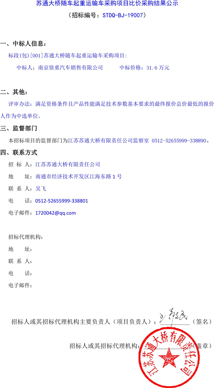 蘇通大橋隨車起重運(yùn)輸車采購(gòu)項(xiàng)目比價(jià)采購(gòu)結(jié)果公示
