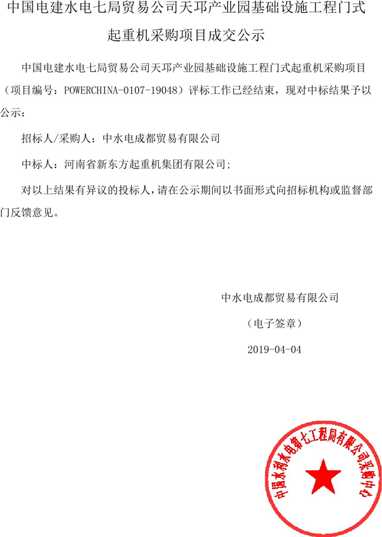中國電建水電七局貿(mào)易公司天邛產(chǎn)業(yè)園基礎設施工程門式起重機采購項目成交公示