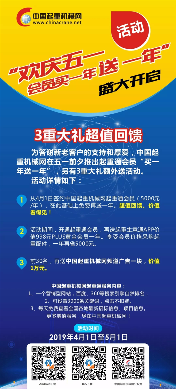 中國起重機(jī)械網(wǎng)開啟慶五一“會員買一年送一年”活動,三重大禮超值回饋,鉅惠活動不容錯過。