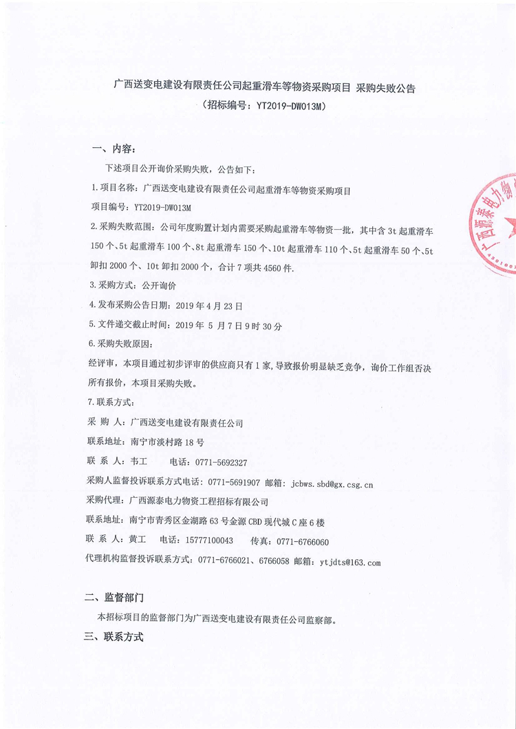廣西送變電建設(shè)有限責(zé)任公司起重滑車等物資采購項目 采購失敗公告