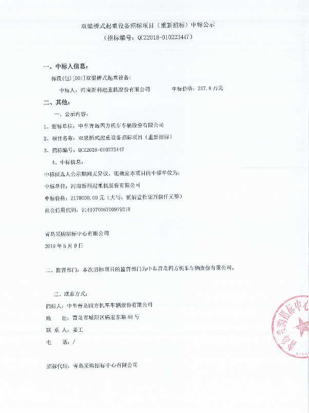 雙梁橋式起重設(shè)備招標(biāo)項目(重新招標(biāo))中標(biāo)公示