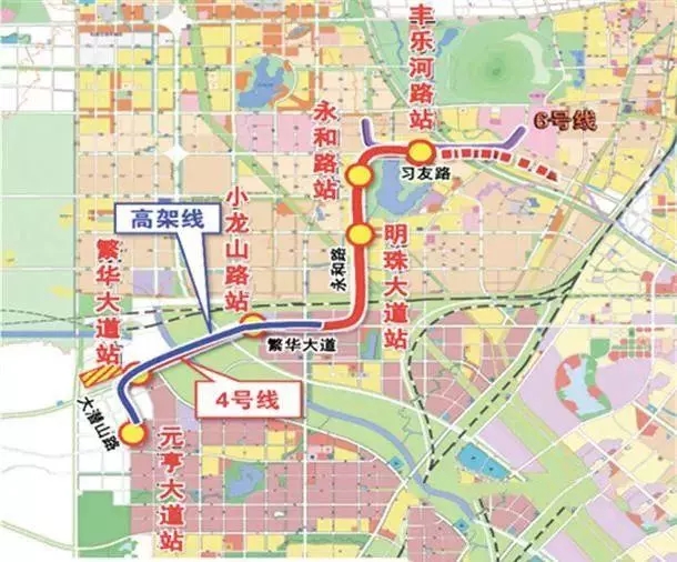 4號(hào)線南延線全長(zhǎng)11.82公里,其中地下線4.4公里,高架線7.42公里,設(shè)站5座,平均站間距2596米。南延線起于4號(hào)線豐樂河路站,沿習(xí)友路、永和路、繁華大道、大潛山路建設(shè),止于元亨大道站。