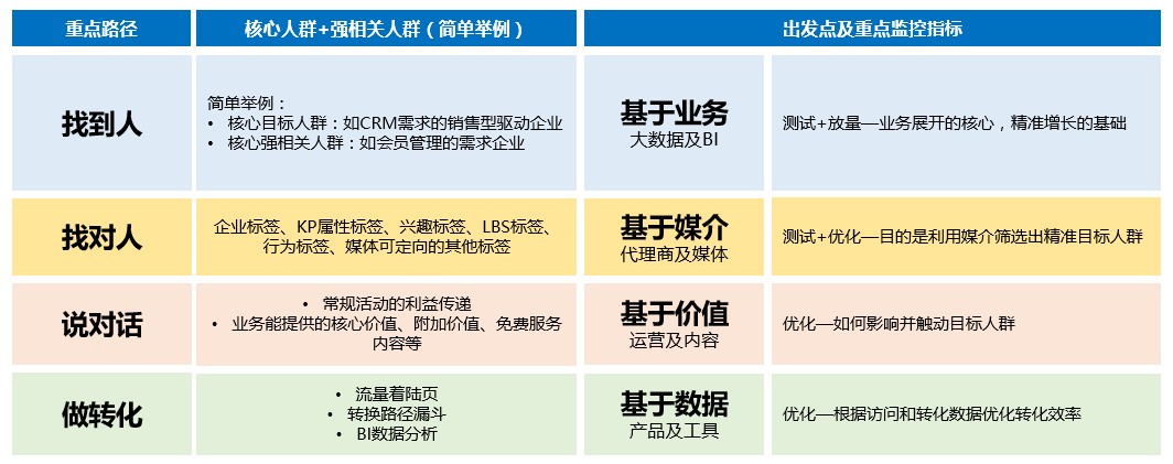 第一步有了大致的目標(biāo)人群方向,就可以準(zhǔn)備搭建初步媒介矩陣進(jìn)行探索和驗(yàn)證了。比如阿里的阿里云和釘釘、滴滴的企業(yè)版、騰訊的騰訊云等國內(nèi)的大廠,有海量的C端用戶和大廠品牌資源背書,可以先用自有C端用戶進(jìn)行媒介嘗試和人群驗(yàn)證。
