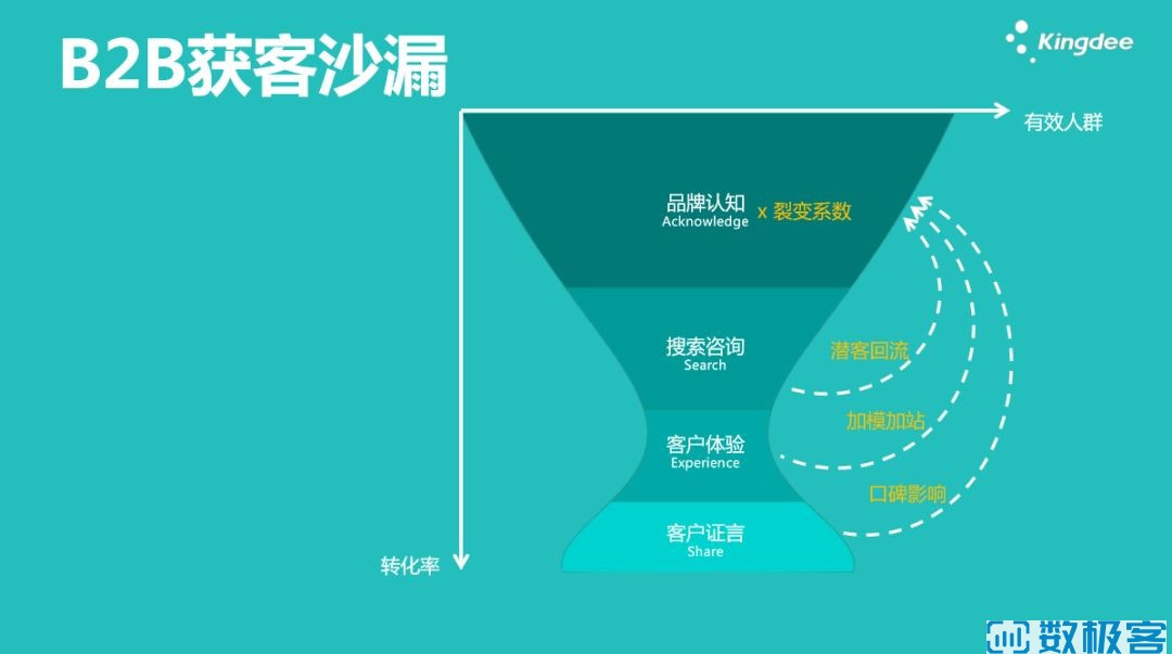 傳統(tǒng)的B2B獲客沙漏,當(dāng)企業(yè)的品牌認知足夠大,客戶會倒過來主動去搜索咨詢他,這之后會進入體驗和使用產(chǎn)品環(huán)節(jié),然后客戶會進行產(chǎn)品反饋,如果體驗良好,就會給出評價形成正向的客戶證言。
